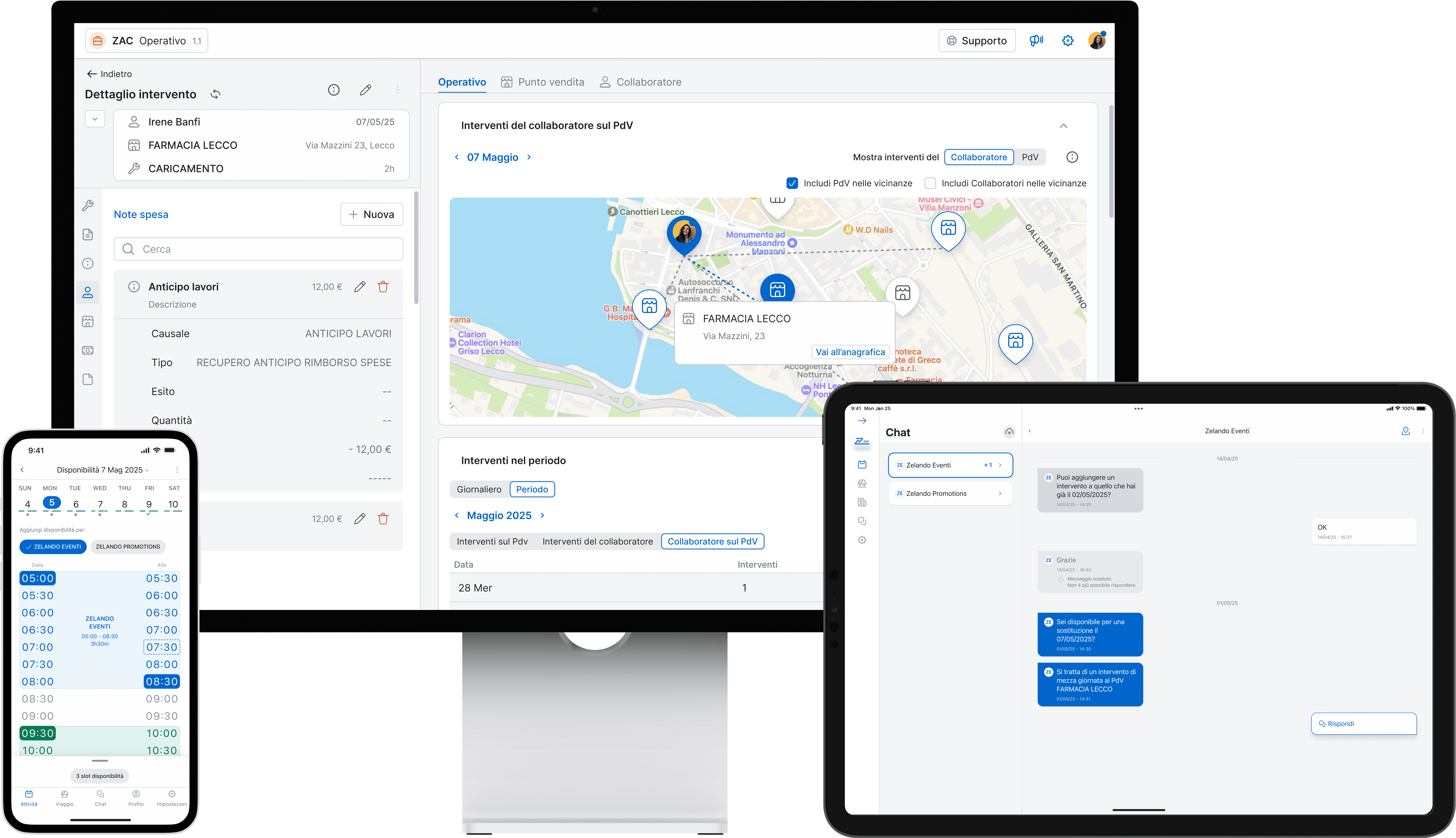 Gestisci pause, viaggi, foto, reportistica e materiale di briefing direttamente da mobile. Comunica con l'agenzia, segnala problemi e aggiorna in tempo reale lo stato dell'intervento.